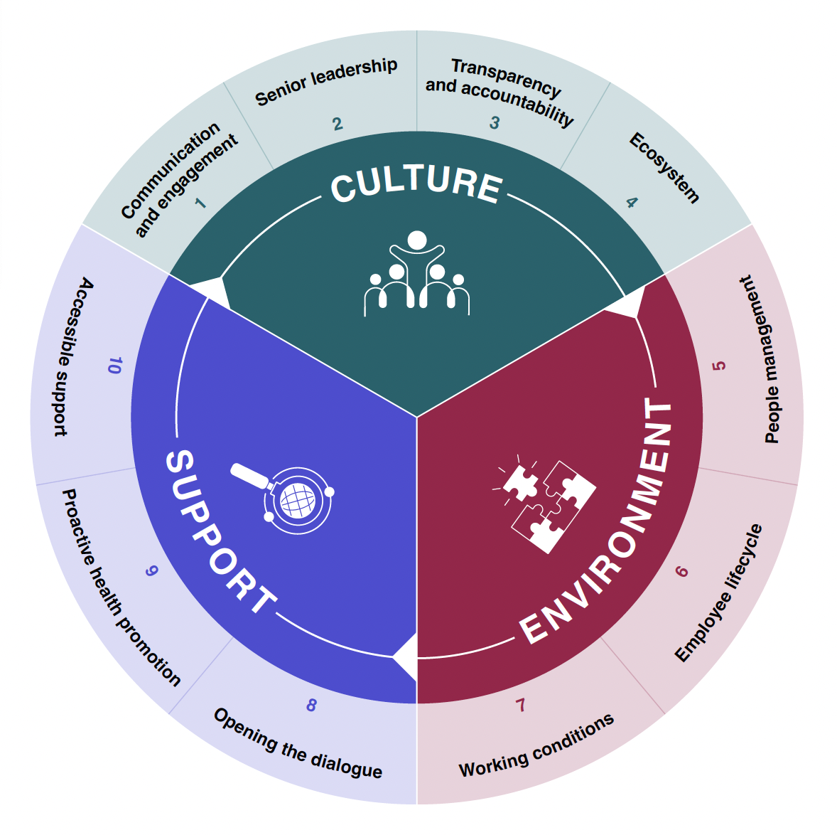 The Framework highlights three areas which your organisation should focus on to promote workplace mental wellbeing: Organisational Culture, Working Environment, and Support for Individuals.  These three Strategic Pillars form the foundation of a holistic approach.