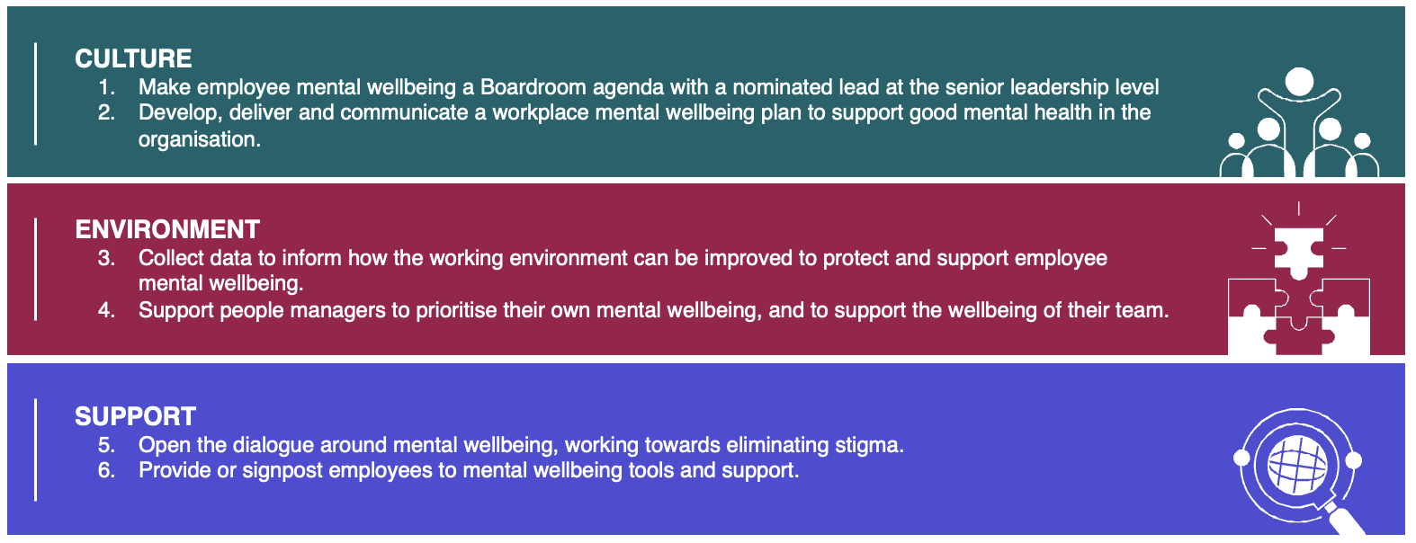 Our 6 Leadership Pledge commitments are aligned to academic research which demonstrates the need to take a holistic approach to employee mental wellbeing that addresses organisational culture, the working environment and access to support.